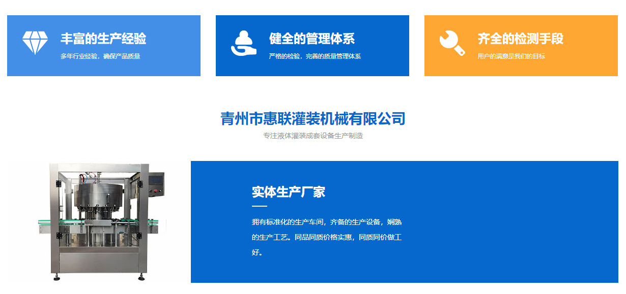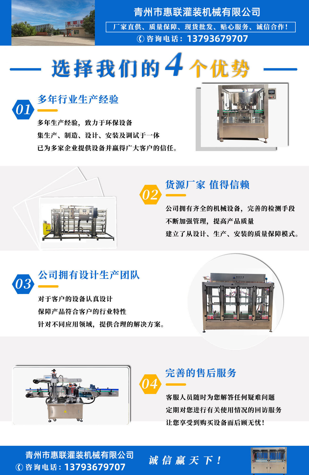 青州市惠聯(lián)灌裝機(jī)械有限公司是一家集生產(chǎn)研發(fā)、銷(xiāo)售、服務(wù)于一體的液體灌裝成套設(shè)備生產(chǎn)企業(yè),可根據(jù)廠家要求設(shè)計(jì)合理液體灌裝生產(chǎn)線,為用戶(hù)提供技術(shù)咨詢(xún)、設(shè)計(jì)工藝、場(chǎng)區(qū)平面布置、工藝改造、設(shè)備安裝調(diào)試等完善服務(wù)。 公司生產(chǎn)制造各種類(lèi)型液體灌裝機(jī)、過(guò)濾機(jī),水處理設(shè)備及液體灌裝成套設(shè)備。主要產(chǎn)品有:白酒、葡萄酒、黃酒等酒水灌裝機(jī)、食用油、機(jī)油、潤(rùn)滑油等油類(lèi)灌裝機(jī)、醬油醋、老抽、生抽等調(diào)味品灌裝機(jī)、防凍液、玻璃水灌裝機(jī)、酒精、84消毒液灌裝機(jī)、車(chē)用尿素灌裝機(jī)、口服液灌裝機(jī)、洗滌劑灌裝機(jī)等多種液體、膏體灌裝設(shè)備,全自動(dòng)/半自動(dòng)灌裝機(jī)型號(hào)多,規(guī)格全,洗瓶機(jī)、瓶子封口機(jī)、打塞機(jī)、熱縮機(jī)、瓶子烘干機(jī)、貼標(biāo)機(jī)、噴碼機(jī)、輸送線、裝箱機(jī)、水處理設(shè)備等全套生產(chǎn)線相關(guān)配套設(shè)備齊全,自產(chǎn)自銷(xiāo),一站式購(gòu)齊,售后無(wú)憂(yōu)。